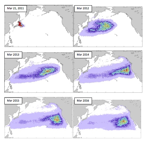 Only models, based on existing knowledge of current flow, wind direction, and other oceanographic data, can help to estimate where the debris may be, and how it is moving across the Pacific. One such model (Maximenko et al., 2011) is shown in the figure below.