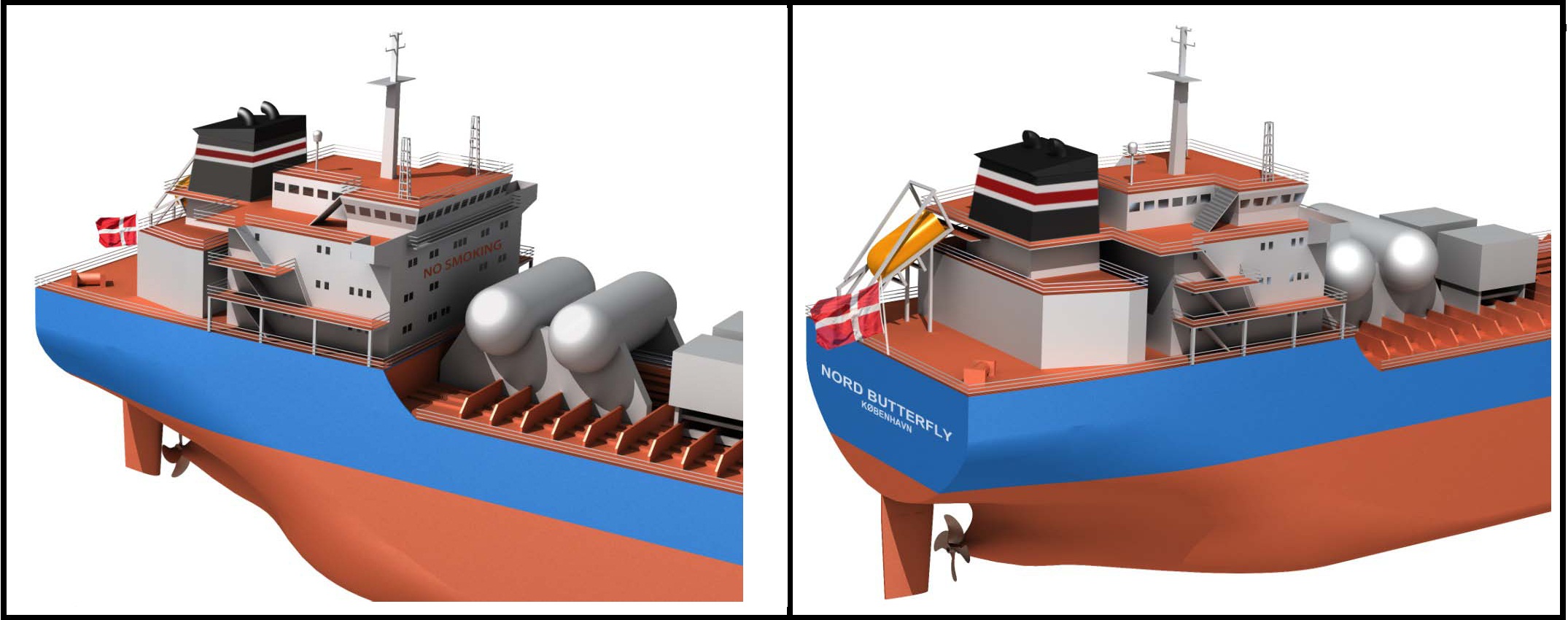 Left: Aftship with LNG tanks seen from the side – Right: Aftship with LNG tanks seen from the stern