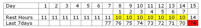 Lets see the arithmetic’s on a daily basis : Daily 24 hours minus MIN 10 hours of rest minus MAX 14 hours of work leaves a balance of ZERO (0) hours. This is OK