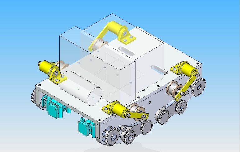 The vehicle mechanical design is essentially determined by the choice of the climbing system. In order to minimize the risk of detaching and crashing, while using a passive adherence system, magnetic tracks are preferred to wheels in virtue of their capability of maximizing the contact area with the metal surface. In order to allow the platform to maneuver between the vertical shell frames, carrying on a small electro-mechanical arm, as discussed in section 2, the resulting length and width of the vehicle are about 49 cm and 43 cm respectively, with a height of about 18 cm excluding the boxes for data acquisition and control electronics and payload devices. A 3-D rendering of the Magnetic Autonomous Robotic Crawler (MARC) is depicted in Fig.2, where dummy parallelepipeds and cylinders represent the cases for control and payload electronics and payload devices respectively. In the bottom part of the vehicle, motors and gear-boxes are displaced on the two sides, leaving free space for batteries along the longitudinal axis and in the rear part of the platform. A couple of transverse openings allow the passage of cables from the batteries to the boxes of electronics.