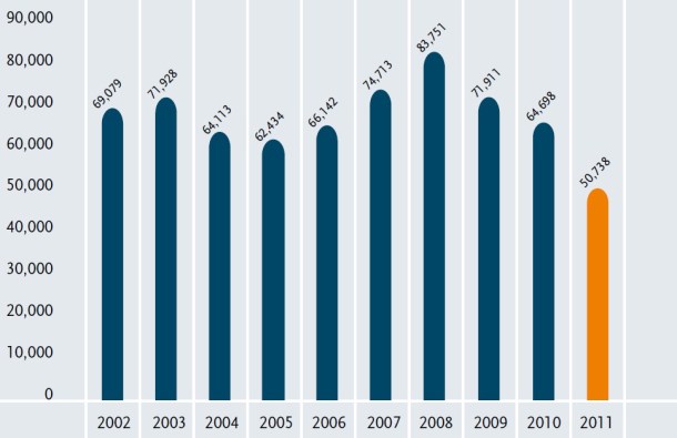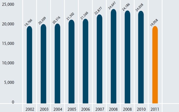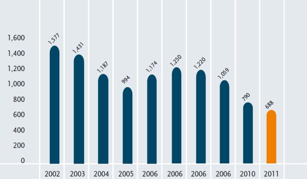The introduction of the New Inspection Regime this year will show an impact on the 2011 figures. Already the number of inspections has dropped from 24,058 in 2010 to 19,058 in 2011, while the number of individual ships inspected had increased from 14,762 in 2010 to 15,268 in 2011. This will also have a consequence for some trends over previous years. Until last year the detention percentage has been decreasing gradually. The trend has not continued and in 2011 the percentage increased to 3.6%. This can be explained since the focus of targeting is on ships with a higher priority. The number of detentions has decreased significantly from 790 in 2010 to 688 in 2011.
