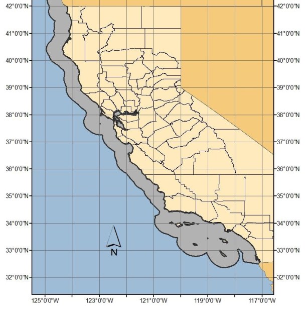 Beginning August 1, 2012 the maximum fuel sulfur (S) limit for marine gas oil (DMA) will decrease from 1.5% to 1.0% S. The maximum fuel S limit for marine diesel oil (DMB) will continue to be 0.5% S. These requirements are enforced within the California OGV regulatory zone, which is 24 nm off the coast of California, including the islands as shown in the figure below.