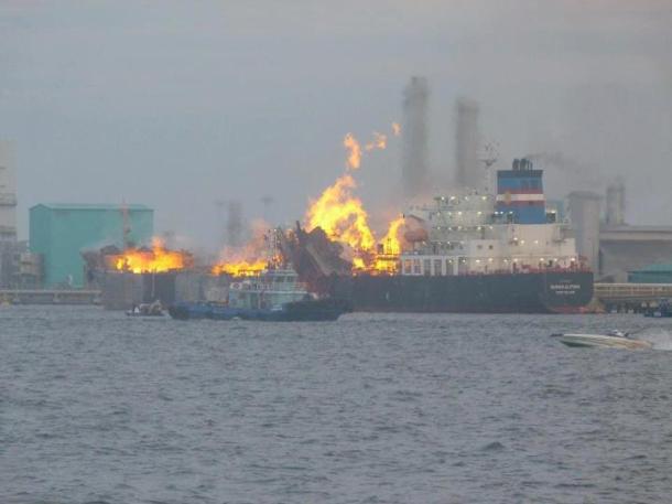 A 38,000 dwt chemical tanker ‘Bunga Alpinia’ was almost destroyed by fire and explosions yesterday morning, while loading methanol at Labuan. It is believed that the accident was caused by lightning, due to heavy rain during the loading procedures, which resulted in several explosions.