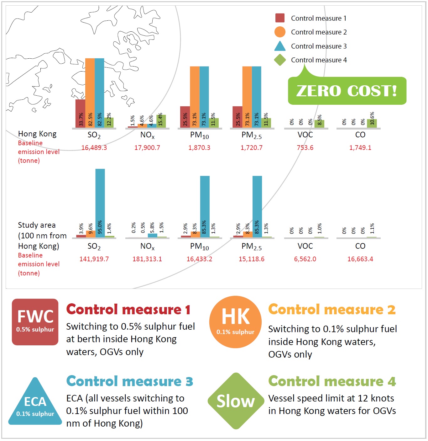 According to the report sulphur dioxide (SO2) emissions from OGVs and the associated public health impacts can be reduced by up to 91% if an ECA covering the waters of the PRD and out to 100 nm from Hong Kong were to be stablished. This substantial reduction in health impacts does not require the development of new technologies or innovative control measures. It simply requires the existing fleet to burn cleaner fuel under widely proven operating conditions. This can be done relatively cheaply, and the costs can and should be shared by the shippers of cargo under the “polluter pays” principle.