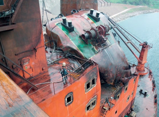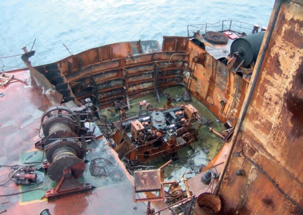 It is likely that the chemicals mentioned above interacted making a small detonation caused the poop deck to lift, allowing air to mix with the compartment’s hydrocarbon-rich atmosphere, created by the release of oils stowed there and from the various hydraulic systems. The resultant explosion tore off the entire poop deck, fully exposing the steering gear compartment (Figure 1), and landing it on the funnel deck (Figure 2). Fortunately, there were only minor smoke inhalation injuries.