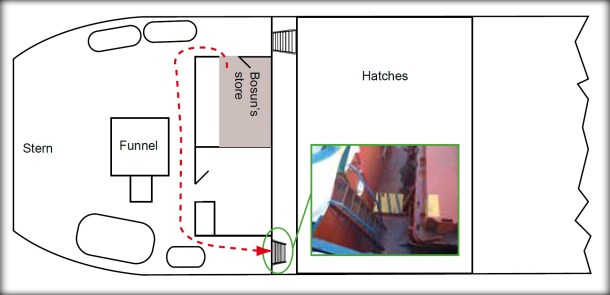 The accident happened soon after the cargo operations were completed. The chief officer instructed the bosun and the deceased seafarer to close the hatches. The two ratings left the bosun’s store and went to the ladder providing access to the main deck on the starboard side (please refer to the figure below). The bosun then went down the ladder and made his way along the starboard side of the main deck towards the straddle lift which was stowed amidships. It is assumed that the deceased also went down the ladder to make his way towards the port platform. Using the deck guardrail as a ladder, the bosun climbed onto the straddle lift platform and waited for the deceased seafarer to appear on the port side.