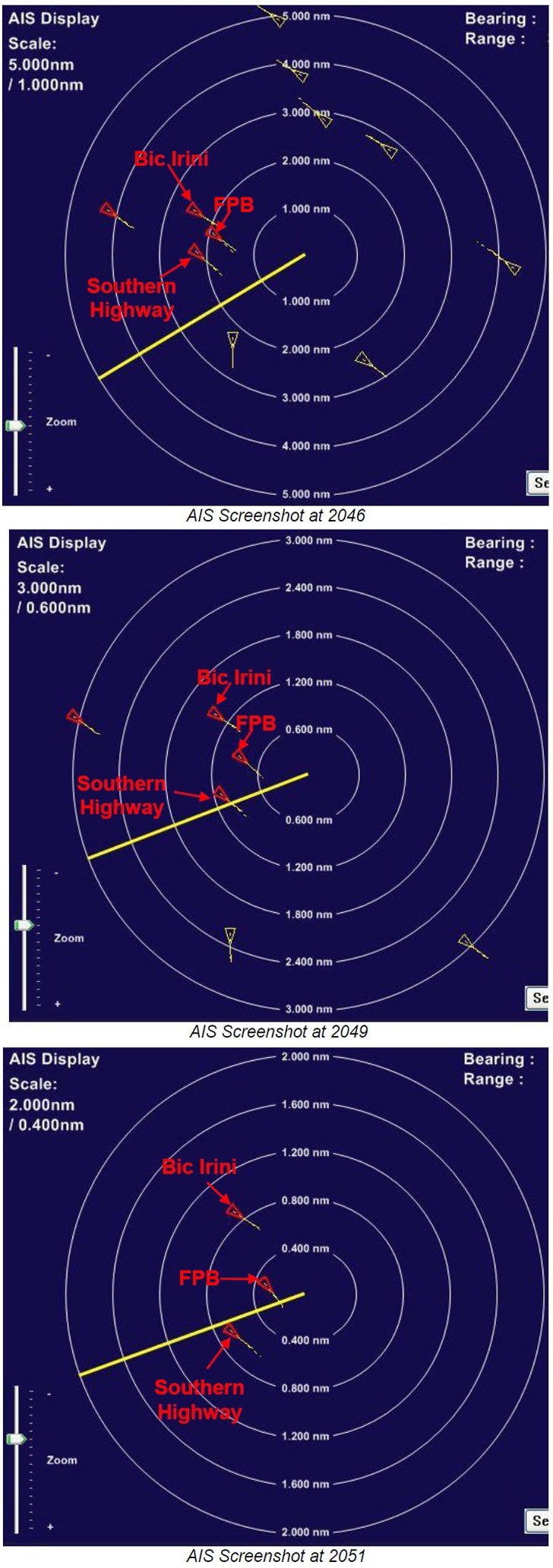 2050 : The 3O checks the AIS and informs the CO of the vessel name “Bic Irini”. The Bic Irini is approximately 1.39nm off the starboard beam. [The 3O and CO are now under the impression the “Bic Irini” is the FPB and the Southern Highway is the FPB].