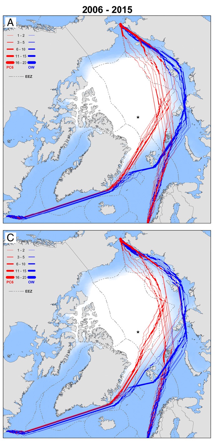 September navigation routes for hypothetical ships seeking to cross the Arctic Ocean between the North Atlantic.and the Pacific (Bering Strait) during consecutive years 2006–2015. Red lines indicate fastest available trans-Arctic routes for Polar Class 6 ships; blue lines indicate fastest available transits for common open water ships. Where overlap occurs, line weights indicate the number of successful transits using the same navigation route. Dashed lines indicate national 200-nm EEZ boundaries; white backdrops indicate period-average sea ice concentrations in 2006–2015.