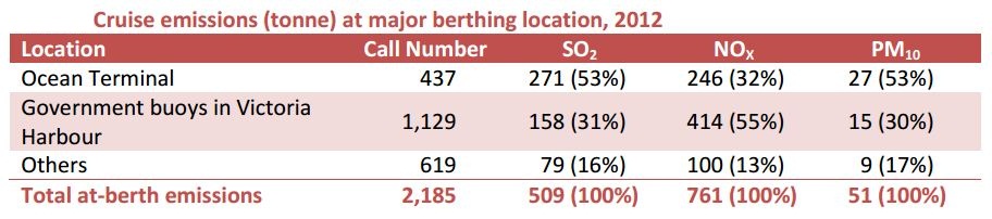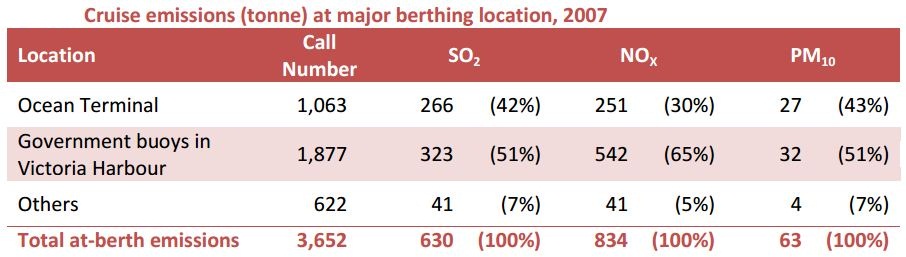 Consistent with Environmental Protection Department’s study on marine vessels emission inventory, close to 60% of cruise ship emissions were produced at berth, the major ones being Ocean Terminal and the government buoys in Victoria Harbour near Hung Hom and Kowloon Bay. Their combined emission of SO2 of 429 tonnes, for example, represents half of total cruise ship emissions in Hong Kong.