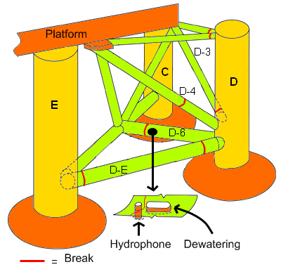 - Fatigue crack growth in brace D6 initiating from pre-existing cracks in the fillet welds between a hydrophone support and the brace