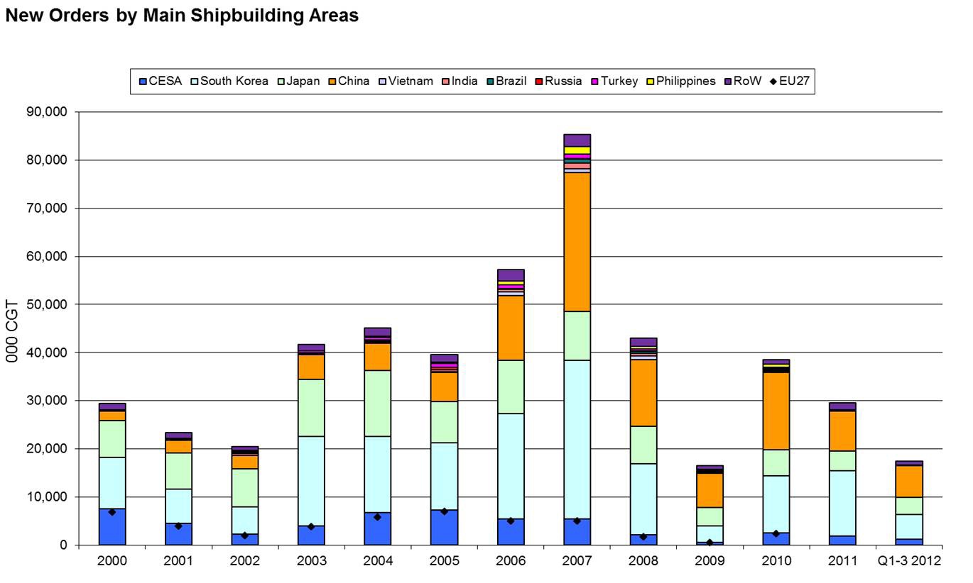 New orders for ships have virtually collapsed from a pre-crisis speculative boom of 85mln cgt to 16 mln cgt in 2009 and have remained low. The expected average order volume is 30-40m cgt annually. At the same time the expanded global shipyard capacity reached new output records year on year peaking in 2012 at around 60m cgt. The capacity expansion in shipbuilding has mainly taken place in China, Korea and other emerging markets, however Europe has refrained from taking this approach. The long production cycle in shipbuilding means that the impact of low orders on the supply chain and on employment is only now being felt. This is particularly concerning for Europe.