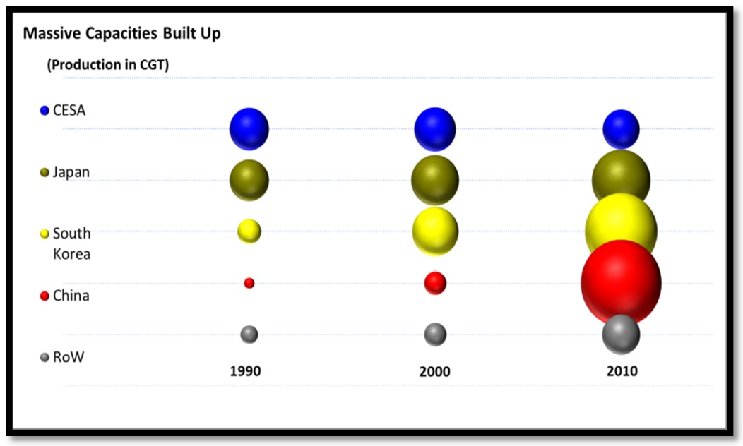 During the last decade the construction of cargo ships has largely shifted to China, Korea and Japan producing four-fifths of the world’s vessels. European production has mainly focused on the production of specialised high-tech ship types.