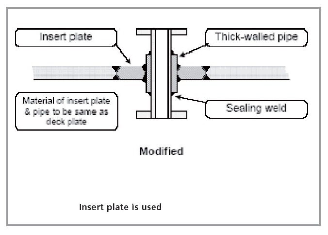 It should be pointed out that a collar plate should always be welded from both sides. In the engine room transverse bulkheads etc. the collar method is completely acceptable provided both sides are welded, but on the main deck in the cargo area it is not recommended.