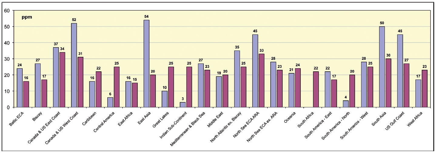 Catalytic fines in ppm in low sulphur fuels, S<1% (blue), compared with regular HFO (red), samples from autumn 2010 (results from DNV Petroleum Services).