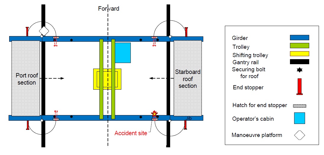 The boatswain was operating the trolley from the operator’s cabin located under the trolley at the forward edge. The trolley was attached to the sliding roof on the port side. The sliding roof was pulled towards the centre of the crane with the trolley. When the roof section was in right position, the cadet and boatswain secured it to the permanent roof structure with the four securing bolts (see simplified drawing of the gantry crane above). The electrician now came up and took over the operation of the trolley. The starboard sliding roof was attached to the trolley and run in towards the centre. The boatswain secured the roof section with the two securing bolts on the forward girder. The deck cadet secured the roof section with the two securing bolts on the aft girder.