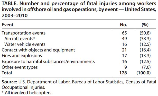 During 2003–2010, the U.S. oil and gas extraction industry (onshore and offshore, combined) had a collective fatality rate seven times higher than for all U.S. workers (27.1 versus 3.8 deaths per 100,000 workers). The 11 lives lost in the 2010 Deepwater Horizon explosion provide a reminder of the hazards involved in offshore drilling. To identify risk factors to offshore oil and gas extraction workers, US CDC analyzed data from the Bureau of Labor Statistics (BLS) Census of Fatal Occupational Injuries (CFOI), a comprehensive database of fatal work injuries, for the period 2003–2010. The following findings of US CDC report describe the results of that analysis, which found that 128 fatalities in activities related to offshore oil and gas operations occurred during this period. Transportation events were the leading cause (65 [51%]); the majority of these involved aircraft (49 [75%]). Nearly one fourth (31 [24%]) of the fatalities occurred among workers whose occupations were classified as “transportation and material moving”.