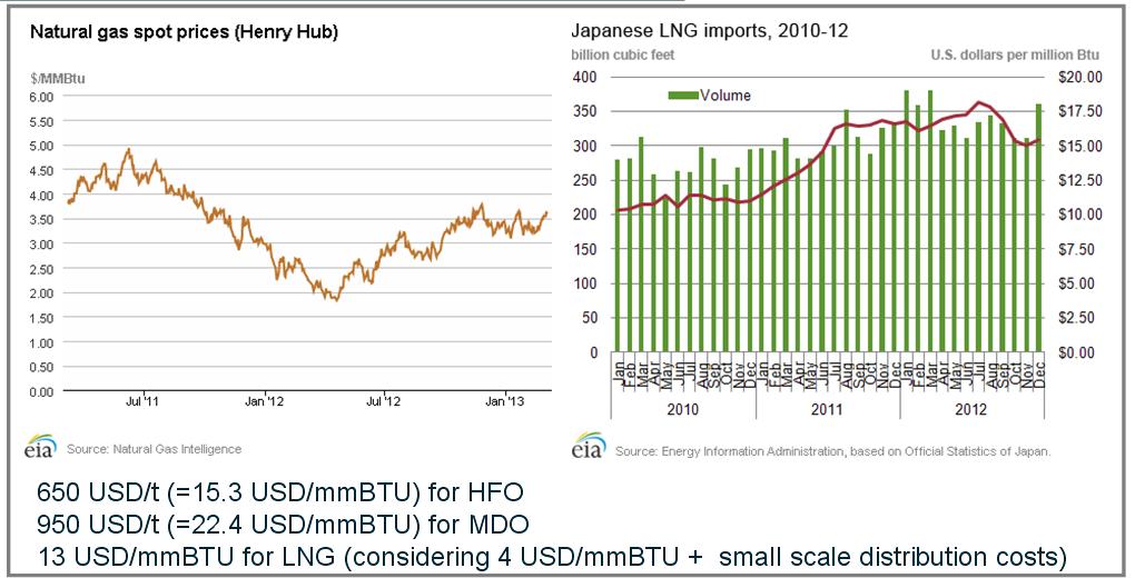 US prices of LNG are six times different in comparison to Japan prices, which is an important difference. If we change 650 USD heavy fuel oil tonnes to energy unit (BTU) it would be about 15,3 USD per million BTU. In order to calculate the total cost of LNG investment, we have to include more expenses. So, practically, the hypothetical price of LNG for 4 USD per million BTU including small scale distribution cost is about 13 USD per million BTU.