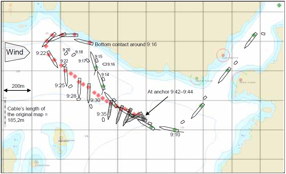 An alarm was received in the engine room at 9:14:45. It was reported that the engine room was making water through the Cedervall seal of the propeller shaft. The water level in the engine room rose. The first alarms about the rising of the bilge water came after 2.5–3 minutes. The leakage was bigger than the capacity of the emergency pumps (a bilge pump 106 m3/h and a seawater cooling pump 340 m3/h). The pumps stopped when their electric motors came into contact with water. The cooling water pressures disappeared when the loose propeller shaft broke the piping to the expansion tank. First the cooling of the main engine and then from the auxiliary engines disappeared and the machineries started to get warmer. It was not possible to use the rudder. The bow thruster had been started already before the grounding so that it could help in manoeuvring the vessel away from the shore. It kept going as long as two auxiliary engines were running. The bow thruster made it possible to turn the vessel away from the shore. It has been estimated that the bow thruster was running 20–25 minutes after the grounding. The machinery stopped one after another. In the deck office the first officer was using the Norcontrol-system to follow the levels in the ballast tanks and alarms coming from the bilge water system. There were not any divergent readings from the ballast tanks. Several bilge alarms came from the engine room. At the same time the boatswain and the second officer, who had gone to the forecastle deck, started preparations for anchoring. The water was too deep to anchor immediately after the turn; depth was 124 m. At 9:25 the towing line was given to the pilot vessel. The bollard of the pilot vessel did not hold the pull, and it came loose at 9:29, but it helped the vessel to turn. With the help of the bow thruster and pushed by wind and the pilot vessel, it was possible to move MV TALI to shallower water (depth 40 m), and a portside anchor was lowered from the vessel at 9:34. The movement of the vessel ended approximately at 9:44. The following figure depicts the movements of MV TALI and pilot vessel. The dots indicating MV TALI are according to the GPS with one minute’s intervals 9:06–9:44. The GPS antenna was on the vessel’s starboard side on the roof of the superstructure, approximately 25 metres from the stern of the vessel (the centre of a green or red dot). Depths less than 10 metres are marked with dark blue colour. The vessel anchored at the position indicated with black dots at 9:42–9:44. The green dots indicate the situation before, red ones after the grounding and black ones at anchor. The position of the rudder has also been sketched for the time interval 09:10–09:15. The vessel marked with a darker colour has lowered the anchor. Even after 9:35, the pilot vessel stayed close to the MV TALI.