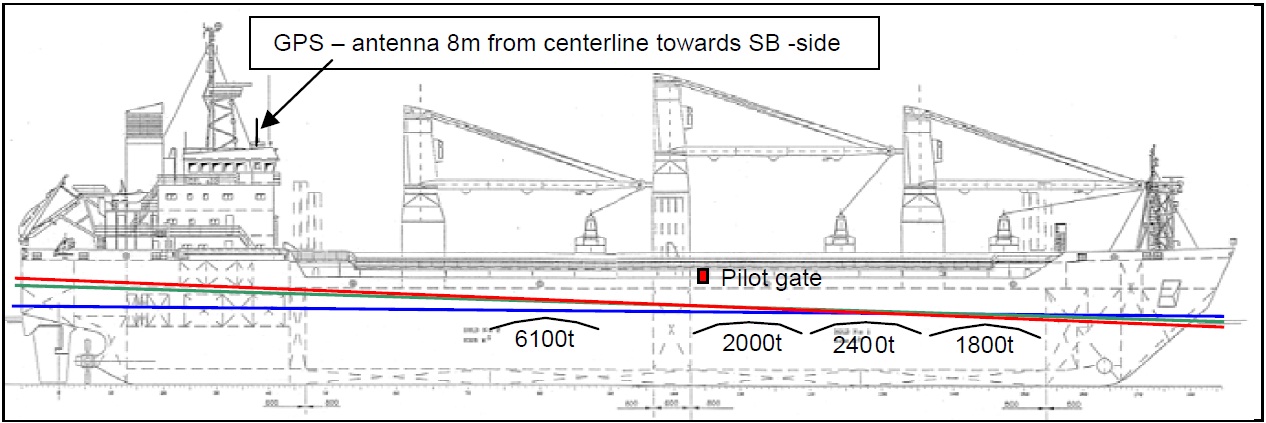 The figure below shows the overall view of MV TALI and various water lines before and after the accident occured. The following have been added to the figure: water lines when the vessel left Jössingfjord (blue), the equilibrium position which resulted from pumping (green) and the position of damage stability calculations when the engine room was full of water (red). The place of the starboard-side pilot gate has also been marked in the picture. It took about 1½ minutes to walk from the pilot gate to the bridge.