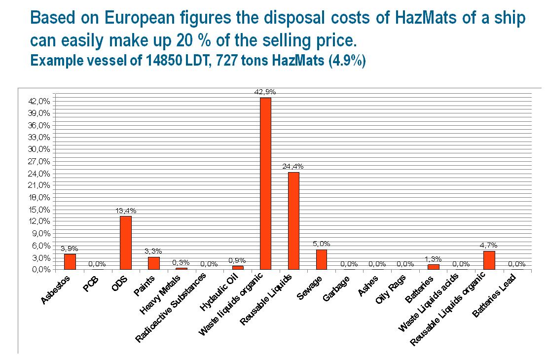 What is the amount of Hazardous Materials on board of a ship? After some documentary research and experience added from projects, a chart has been created providing a general orientation. It shows the average content of Hazardous Materials of a medium size vessel. There is a variety of materials and some of them are already prohibited. An important aspect of this is that the recycling cost of these materials can easily make up 20 % of the vessel’s selling price.