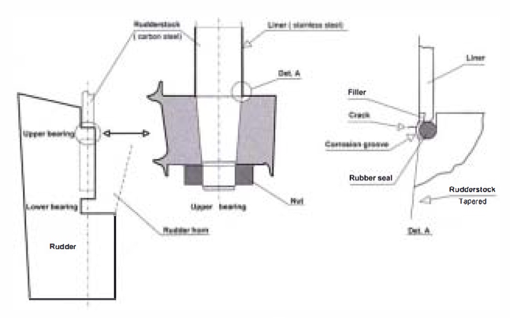 The sealing at the end of the stainless steel liner proved to be insufficient to prevent ingress of seawater to the tapered surface of the rudderstock. Consequently, a galvanic element was built, the stainless steel being the cathode and the carbon steel the anode. Thus the suffering part in this case was the rudderstock.