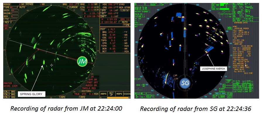 SG – A few minutes later, at 22:26:00 hours, JOSEPHINE MAERSK’s closest point of approach (CPA) was indicated as 0.03 nm and the time to the closest point of approach (TCPA) was indicated as 8:59 minutes on the radar of SPRING GLORY. SPRING GLORY maintained its course and speed.