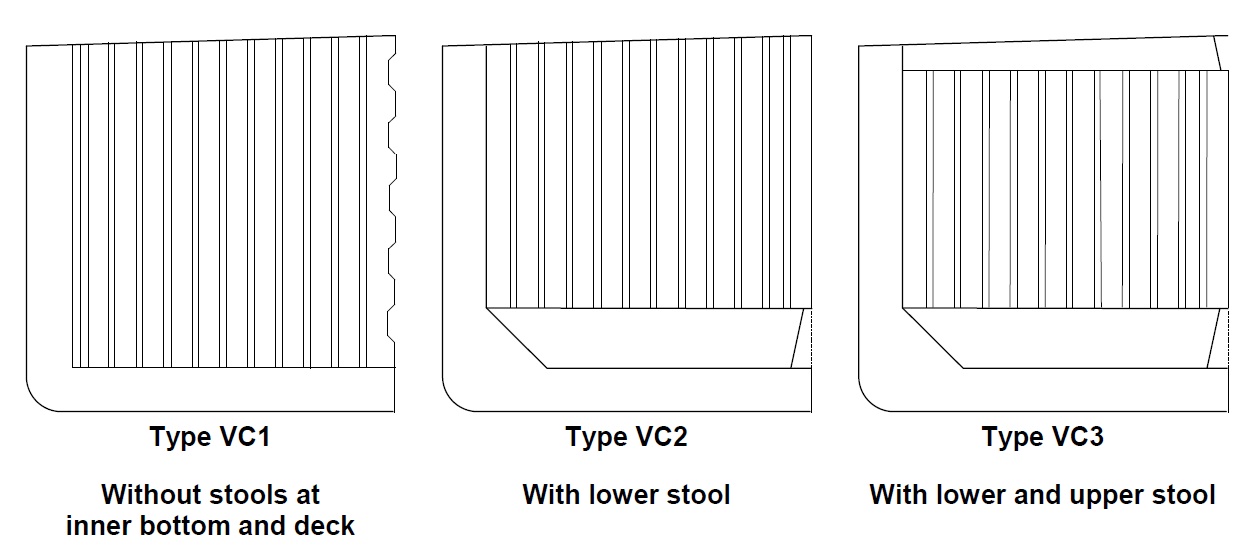 - Without stools at inner bottom – Type VC1. Type VC1 arrangement is most common on smaller tankers including product tankers and chemical carriers.