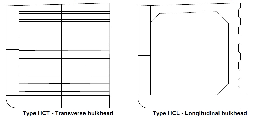 - Bulkhead arranged longitudinally – Type HCL. This arrangement is most common on smaller tankers including product tankers and chemical carriers where the efficiency of tank cleaning is of primary importance.