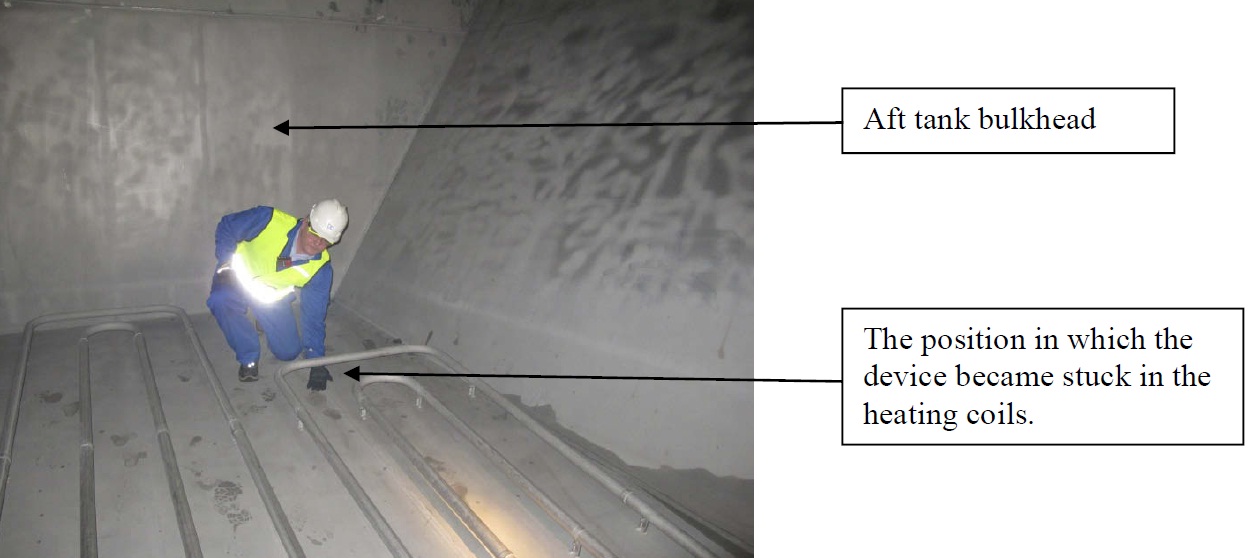 When a cargo sample was to be collected from cargo tank 7P after loading in Eastham, the tube became stuck in the heating coils at the bottom of the tank(see image below). After unsuccessful attempts to dislodge the tube and retrieve the sampling device from the tank, the measuring tape was temporarily fastened above deck to prevent the whole sampling device from disappearing into the cargo tank.