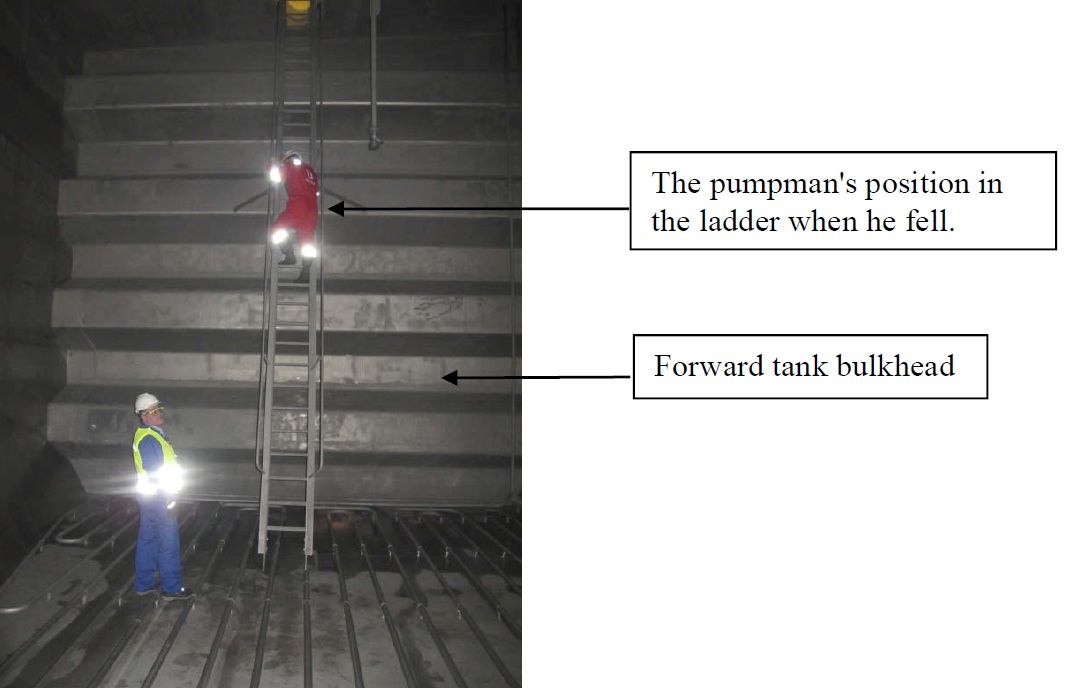 The pumpman took two deep breaths before climbing down the inside ladder on the forward side of the cargo tank. From the deck, the deck crew member keeping watch at the hatch saw the pumpman reach the bottom of the tank and walk aft. About halfway across the tank bottom, the pumpman turned back and moved quickly to reach the ladder. He started climbing, but halfway up the ladder he fell backwards, back into the tank. He fell approximately 4 – 5 metres (see image below), and lay lifeless at the bottom of the cargo tank. The time was then 14:45.