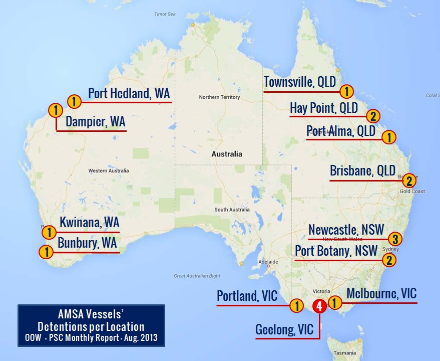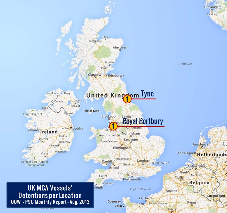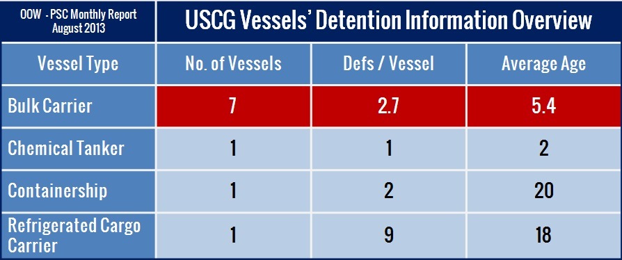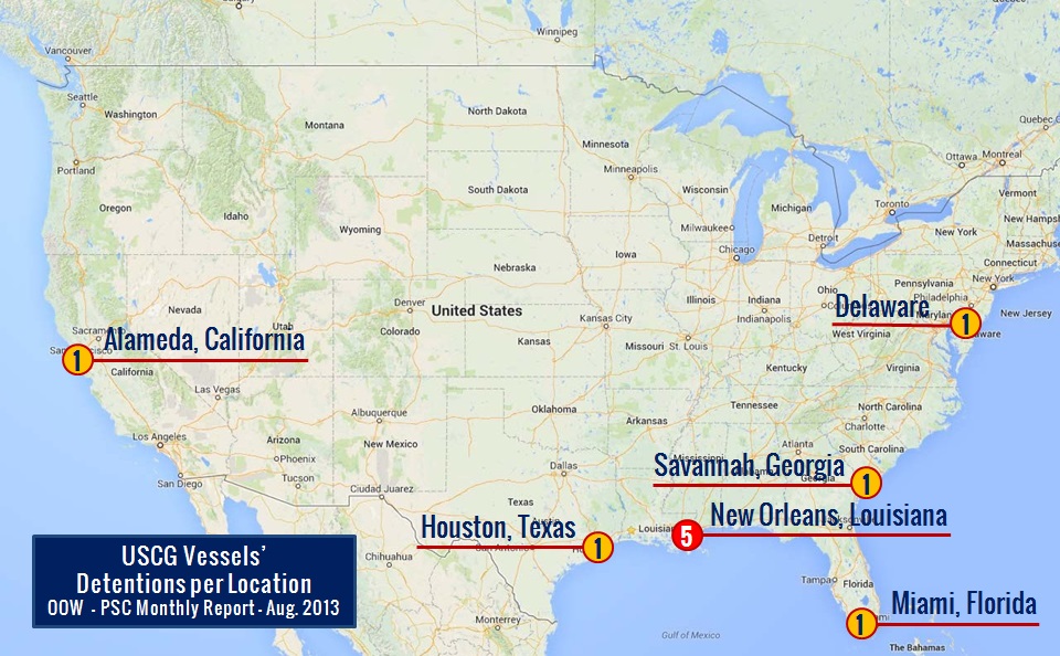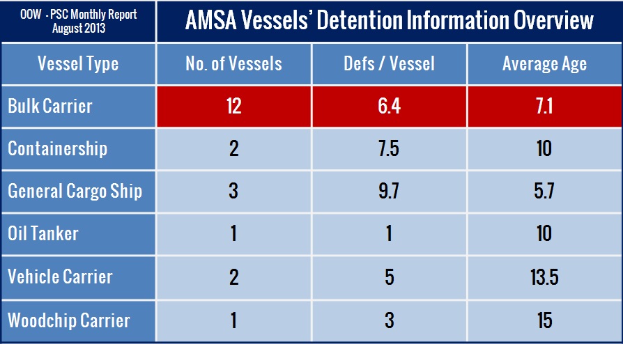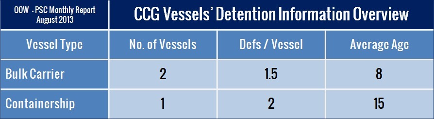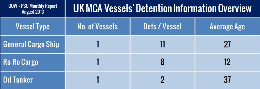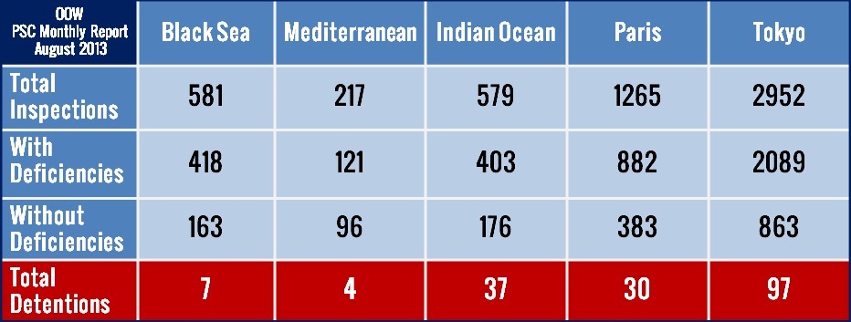 During August 2013 the PSC detention in the Paris MoU area showed a slight decrease compared to July 2013. In the Tokyo MoU areas there has been a greater decrease of the vessels’ detentions, in August 2013 there were 97 detentions while during July 2013 there were 130. The number of detentions in the Mediterranean MoU has been decreased from 18 to just 4, maybe as a result of the civil unrest in Egypt during August. The Indian Ocean MoU detentions number remained the same for the month under review, that is 37. Finally there has been a decrease in the Black Sea MoU detentions from 15 to 7. A PDF version of this post is also available for download. Please click the following link in order to download OOW PSC Monthly Report for August 2013. The PDF version of this report can be also found in the OOW profile in Scribd by clicking HERE.