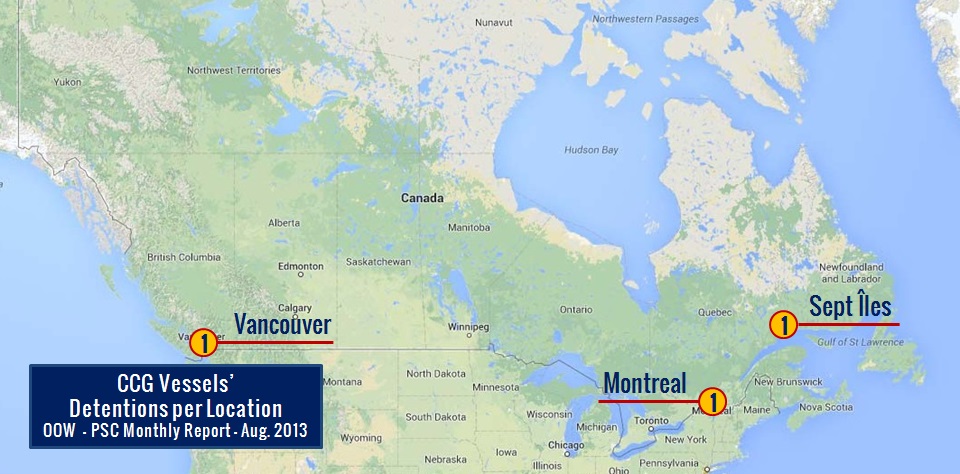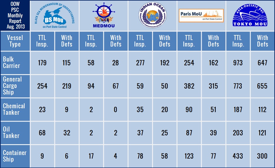The tables contained in the monthly PSC report summarize the number Total Inspections, Inspections With Deficiencies and Inspections Without Deficiencies that have been conducted in the major PSC MoUs areas. The statistics that are being published each month in the Officer of the Watch blog are based in data available to the Black Sea MoU, the Mediterranean MoU, the Indian Ocean MoU, the Paris MoU and Tokyo MoU. Each month’s PSC report contains also information from the USCG, the MCA, the AMSA and Canadian Coast Guard, these information are presented as reference to the type of deficiencies that are being identified through PSC inspections.