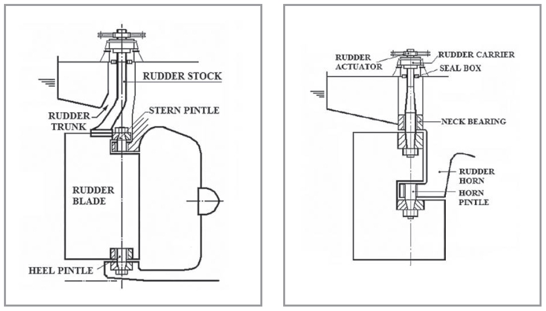 Left figure above: Principle illustration of a very old rudder trunk design with asymmetric rudder stock (dog leg type). Right figure above: Principle illustration of a semi-spade rudder and the concentric rudder stock. This design gives no reason for an open accessible rudder trunk.