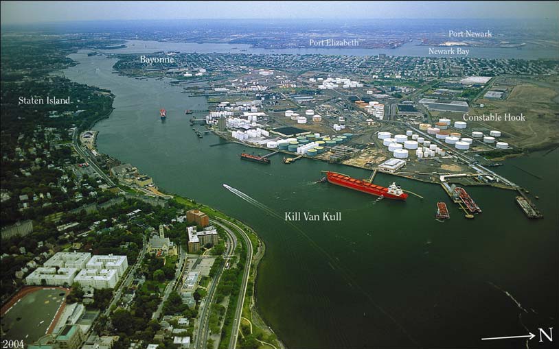 Photo above: View of the Kill Van Kull looking west toward Bayonne and Newark Bay. The New Delhi Express was on its way to Port Newark, at right rear of photo, when it went aground just past the Bayonne Bridge (upper left). (Red vessel in foreground is not the New Delhi Express.)