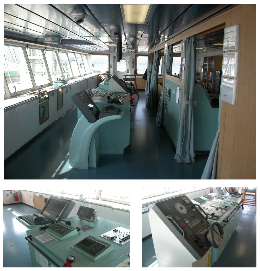 Photos above: Bridge of the New Delhi Express. Top photo shows the overall layout. Bottom left photo shows the docking pilot’s position at the port radar. Bottom right photo shows the helmsman’s station (bridge telegraph knob is immediately to right).