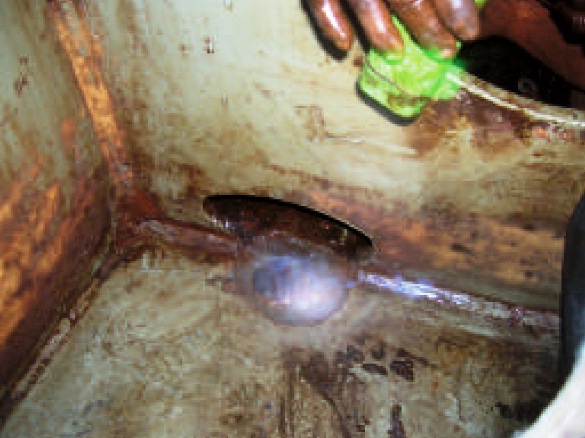 Water ingress to the engine room of a bulk carrier was discovered during a voyage. The leakage was found to come through the short sounding pipe of the bilge water holding tank in the double bottom. After the visual inspection of the tank, the sea water ingress was found to come through an approximately 45 mm diameter area of serious pitting/hole in bottom plate (see figure below).