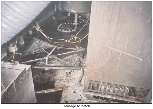 30 October 2004, 1826 hours – After the explosion, the vessel’s forward foam monitor was activated by the crew. The master started the monitor’s pump at the bridge console. The running light on the console did not illuminate and the master pressed the start button again. This second depression caused the pump to trip, and the flow of water to the monitor stopped after only a few seconds. The master again attempted to start this pump, but it failed again and the crew abandoned their efforts to use the monitor. The master started the fire pump from the bridge console and two fire hoses were then rolled out and connected to the fire main. These were then used to cool the aft bulkhead and deck of the forecastle. One was also directed through the hatch in the top of the forecastle’s deckhouse. Smoke continued to issue from the hatch, door and vents of the forecastle deckhouse.