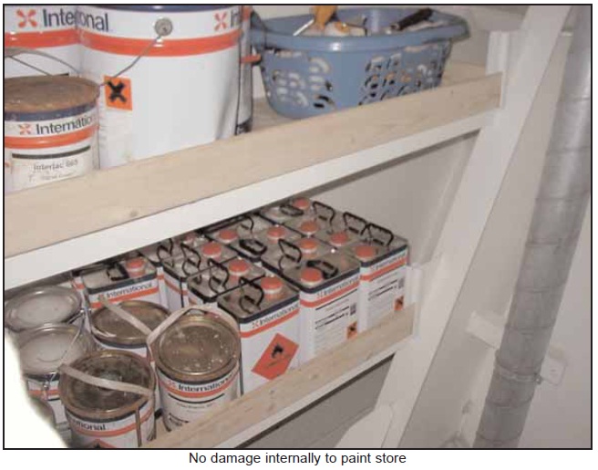 The vessel’s fire alarm was sounding and the fire display panel on the bridge indicated a ‘manual call’ in the forecastle. The master halted all mooring operations and tried to contact the ABs forward. He then radioed Port Control to report the accident, requesting fire-fighting assistance, and rang finished with engines. He also arranged for the chief officer to go forward, and telephoned the engine room to request electrical power to be shut off the forecastle and to tell the engineers of the explosion.