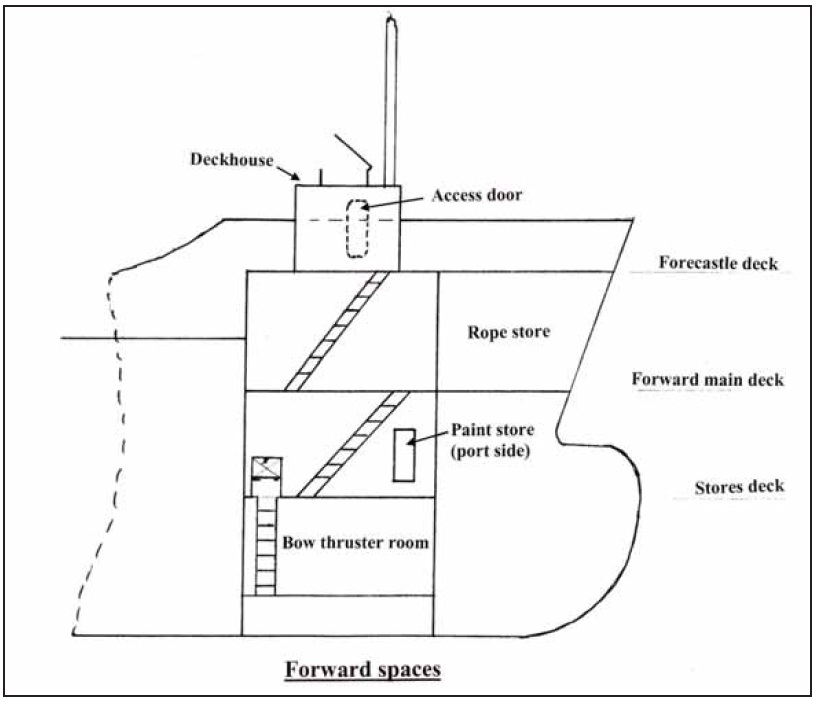30 October 2004, 1823 hours – The master noticed that the bow thruster’s setting was not at zero. He gave the control a small nudge to correct this. Coincidentally with this adjustment there was an explosion within the forecastle head, throwing flame and burning material through the hatches, door and vents in the forecastle deckhouse.