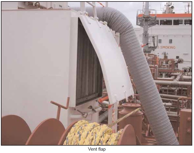 Following these events, the spectacle plate between the discharge from the gas freeing fans and the cargo system was changed to the ‘blanked’ position (see figure below). Also, at about this time, the gap between the vessel’s bow and the jetty was noticed and extra lines were put out to secure the vessel.