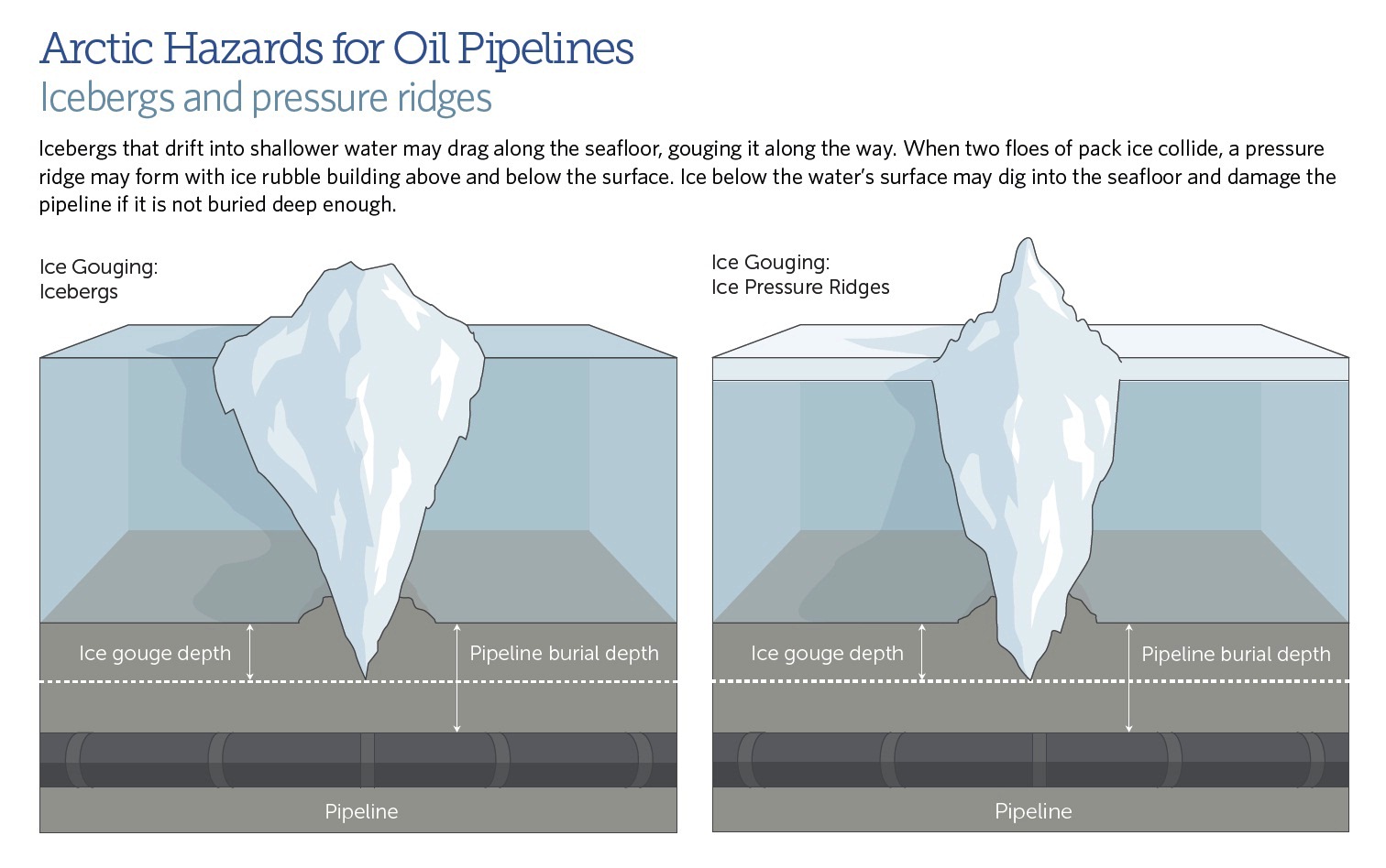 - Pipelines should be buried below the depths of seabed ice gouging and ice strudel, and be designed to minimize settling due to permafrost thaw.