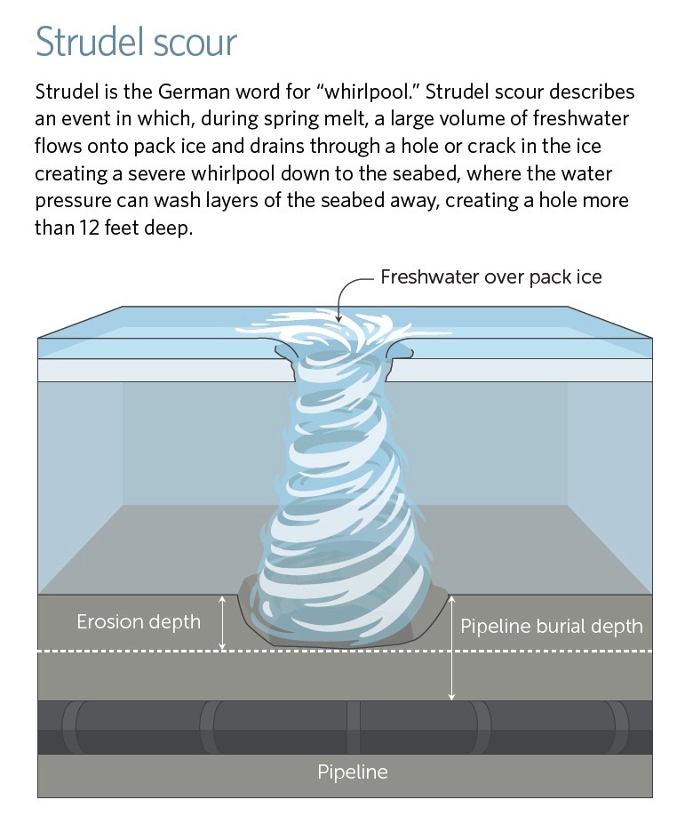 Arctic OCS pipelines must be buried at a sufficient depth to avoid damage. Pipeline damage may occur from ice gouging by icebergs and ice-pressure ridging (two floes of ice coming together) and strudel scour (whirlpools that wash away the seabed). Pipelines buried in frozen soil (permafrost) must also be designed to minimize heat transfer to soil that can cause the frozen soil to melt and the pipeline to be subjected to bending stresses as it sags (see figures below)