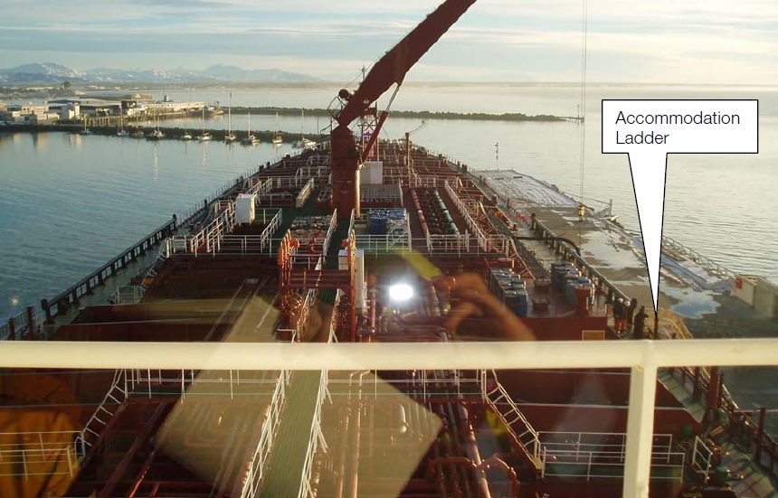 12 June 2006, 1515 hours – The chemical tanker Formosa Thirteen departed the tanker berth at Seaview, Wellington Harbour, bound for Timaru. The weather was a south/southwest wind, 40-50 knots with poor visibility. The significant swell height at the harbour entrance was about four metres. The Pilot intended to disembark using the starboard side combination pilot and accommodation ladders that were located just abaft the mid point of the vessel, when south of Wellington Harbour entrance (see figure below – photograph showing view from the Pilot’s position on the bridge).