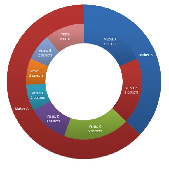 The below pie depicts the incidents of defects by manufacturer and vessel. We can see that a total of 27 defects occurred in a fleet of 8 Tankers, over the past 5 years. The fleet average Mean Time Between Failure resulted in 13000hrs, in other words 1,5 years. The total amount spent for the repair of the subject defects was 60,000 USD.