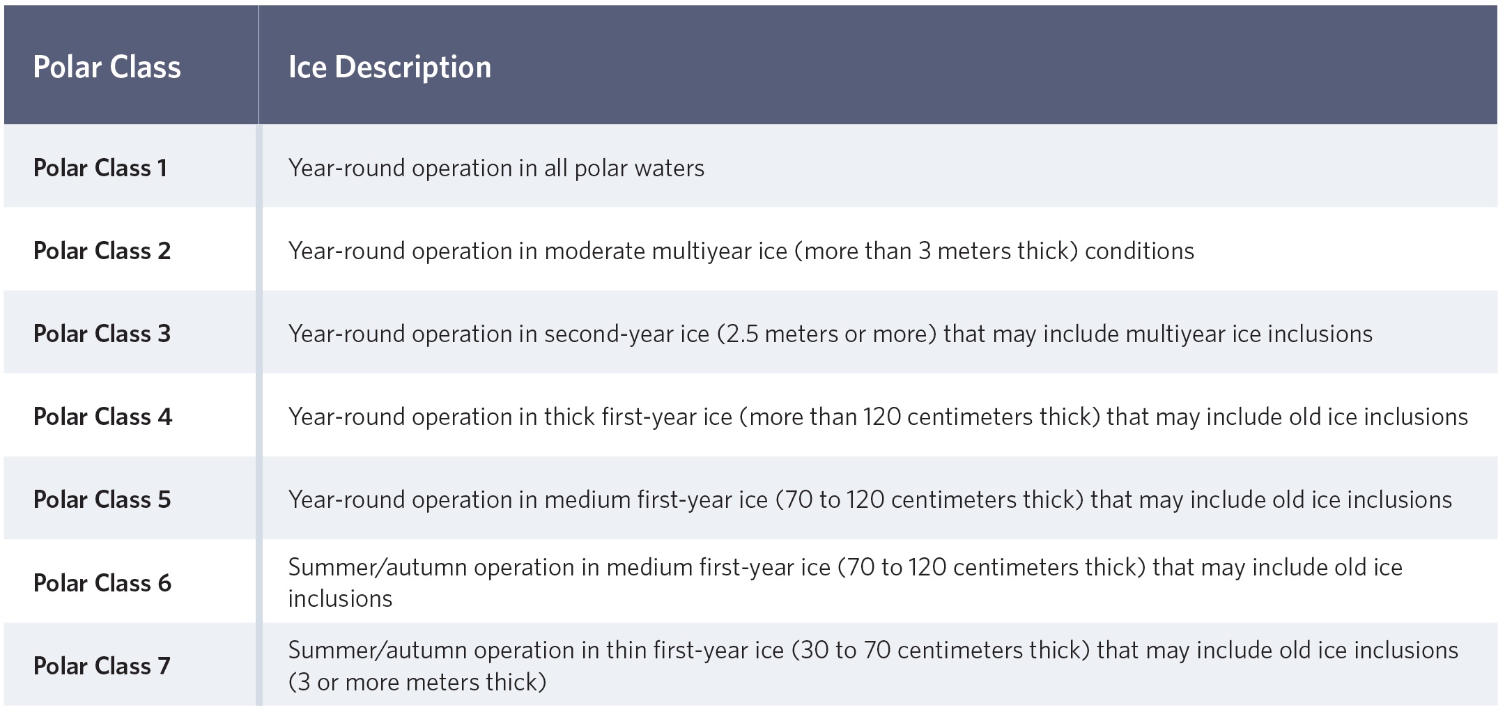 Polar Class designations range from Polar Class 1, the strongest vessel that is capable of year-round operation in all polar waters in thick ice, to Polar Class 7, the lowest-strength vessel capable of operating in summer and autumn’s new, thinner ice. These ratings are applied to all types of vessels operating in polar waters, not just MODUs.