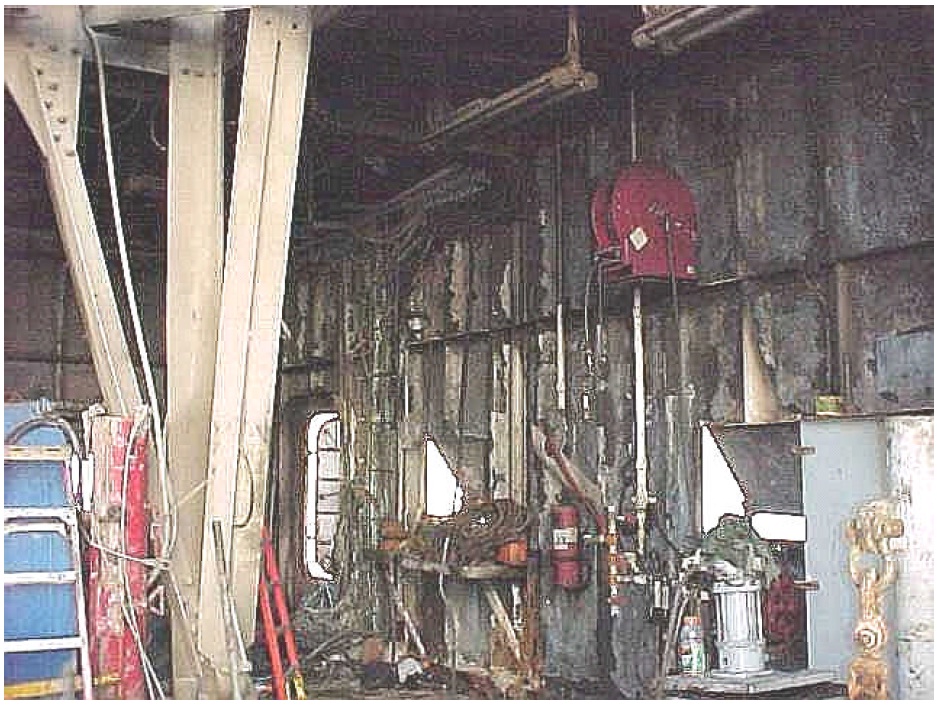 Photo above: Portside drill floor motor shed, above diverter, after fire.