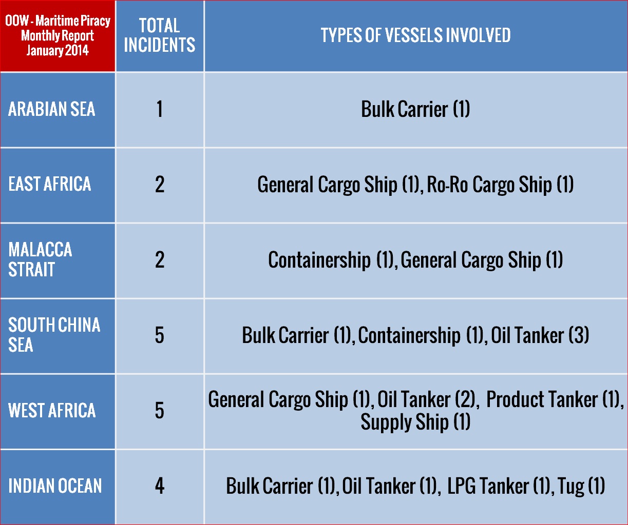 Suritec was established in 2001 by a group of professionals with the goal of applying our background and expertise in knowledge management and intelligence to develop software and other technology solutions. Suritec’s present clients range from government departments, parastatals, commercial companies in the mining and retail sector to specialized crime and risk prevention consultancies. Suritec issues monthly Maritime Piracy Reports summarizing events related to maritime piracy. We would like to thank Suritec and Mrs. Lydelle Joubert for their kind permission to include part of their report in the OOW Monthly Maritime Piracy Report. |