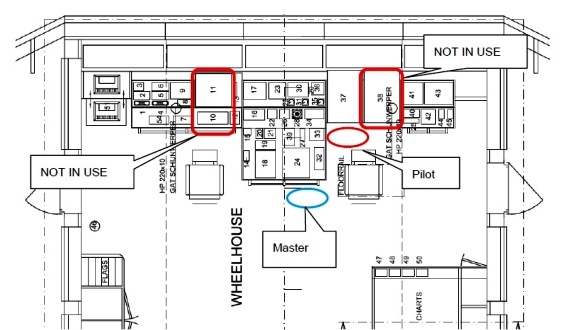 The wheelhouse of MS NORDLAND as well as the positions of the master before the the accident and the pilot at the time of the accident.