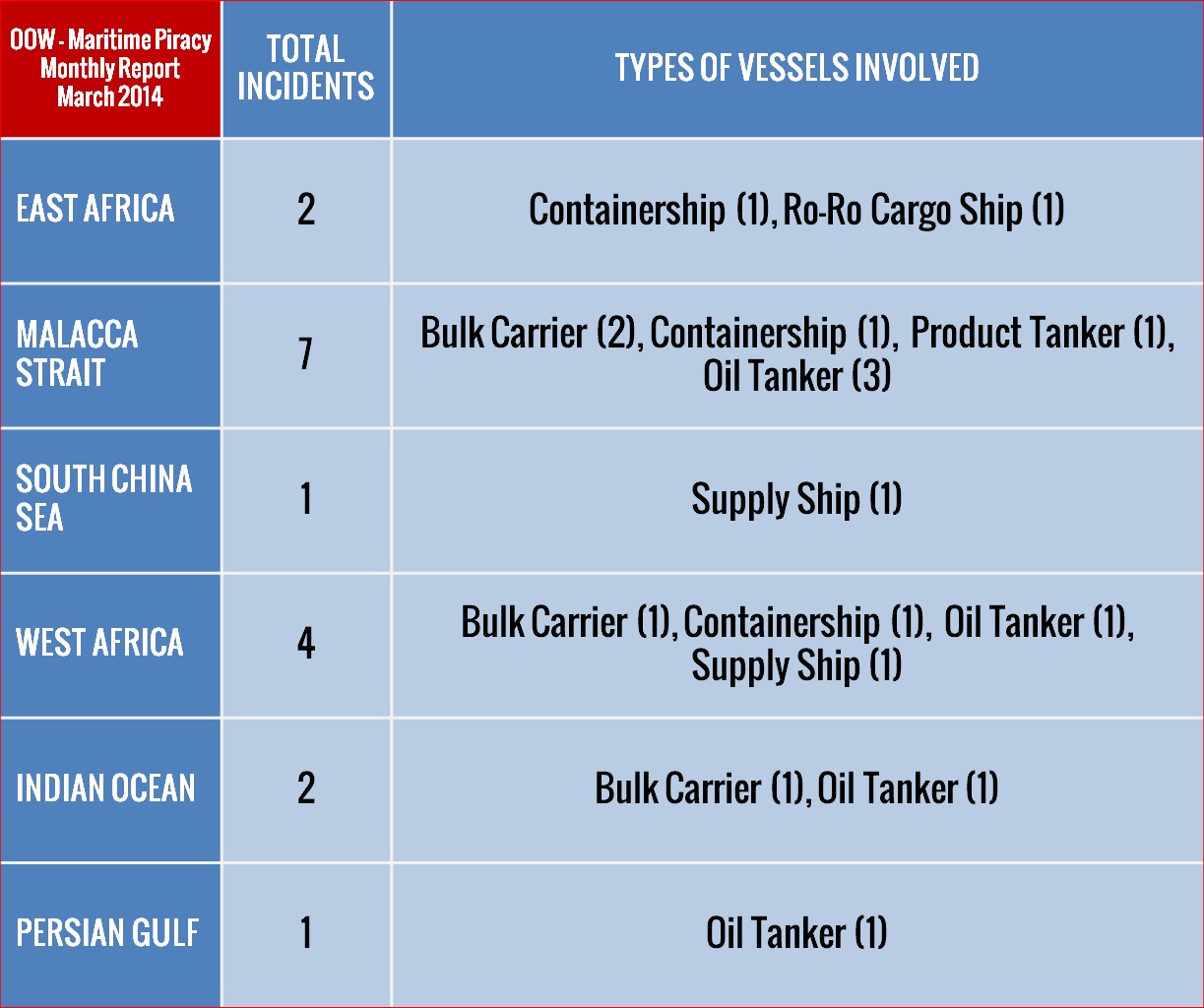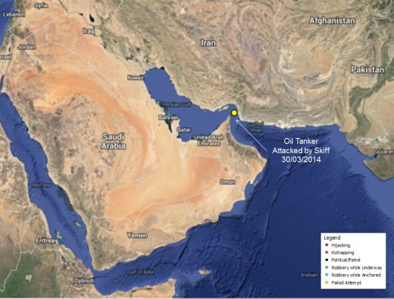 - On 30 March 2014 six armed men in a skiff fired on a tanker in the Strait of Hormuz, Oman. NATO Shipping Centre downgraded this attack to a suspicious approach as they did not judge it to be piracy related.