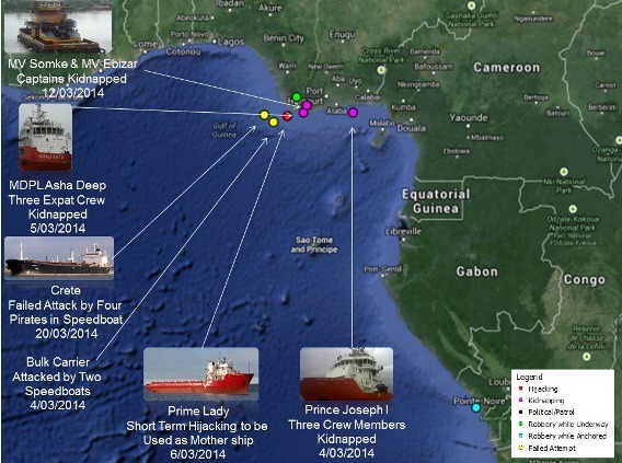 - Four incidents of kidnapping of crew members were reported off the Nigerian coast.